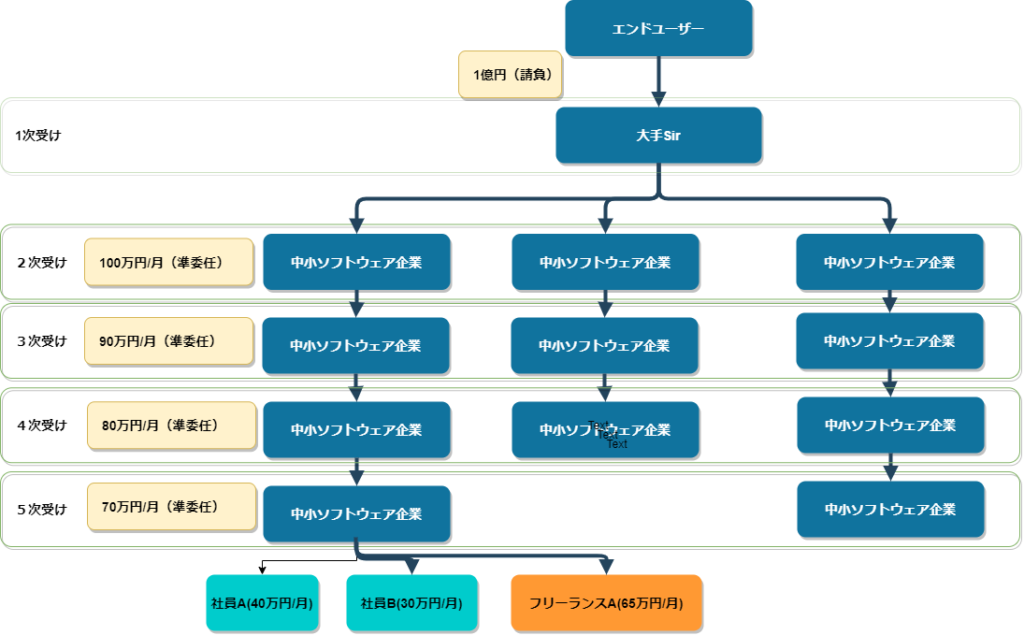 2次受け以降は、中小企業が下請け企業として、準委任契約で発注され、人をひとりいれるたびにマージンを抜いていきます。